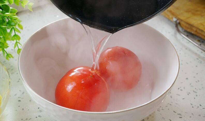 1、准备两个西红柿,清洗干净,在西红柿上面放一把十字形刀,然后放入碗中备用;锅中倒入适量的水,大火烧开,浇在西红柿上,让西红柿在沸水中浸泡5分钟。 5分钟后,将西红柿取出,剥掉西红柿的皮,剪掉西红柿的硬茎,然后切成小块。全部切好后,放入盘中备用;
