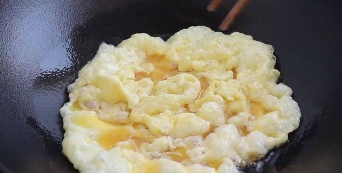 3、将锅烧热,倒入适量食用油。油热后倒入打散的蛋液,刚倒入锅时蛋液不要动。鸡蛋逐渐变得蓬松、增大。打开中火,将鸡蛋放入锅中搅拌。煎至鸡蛋全部凝固,然后将鸡蛋打成小块备用;