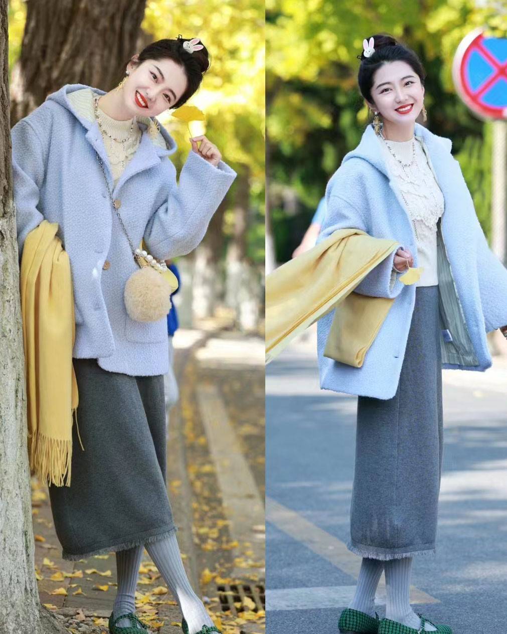 比如图中这件外套选用的浅蓝色,就是很具有代表性的清爽色系,与白色一样是很显肤色干净亮丽的色调,但又蕴含了更足的辨识度。