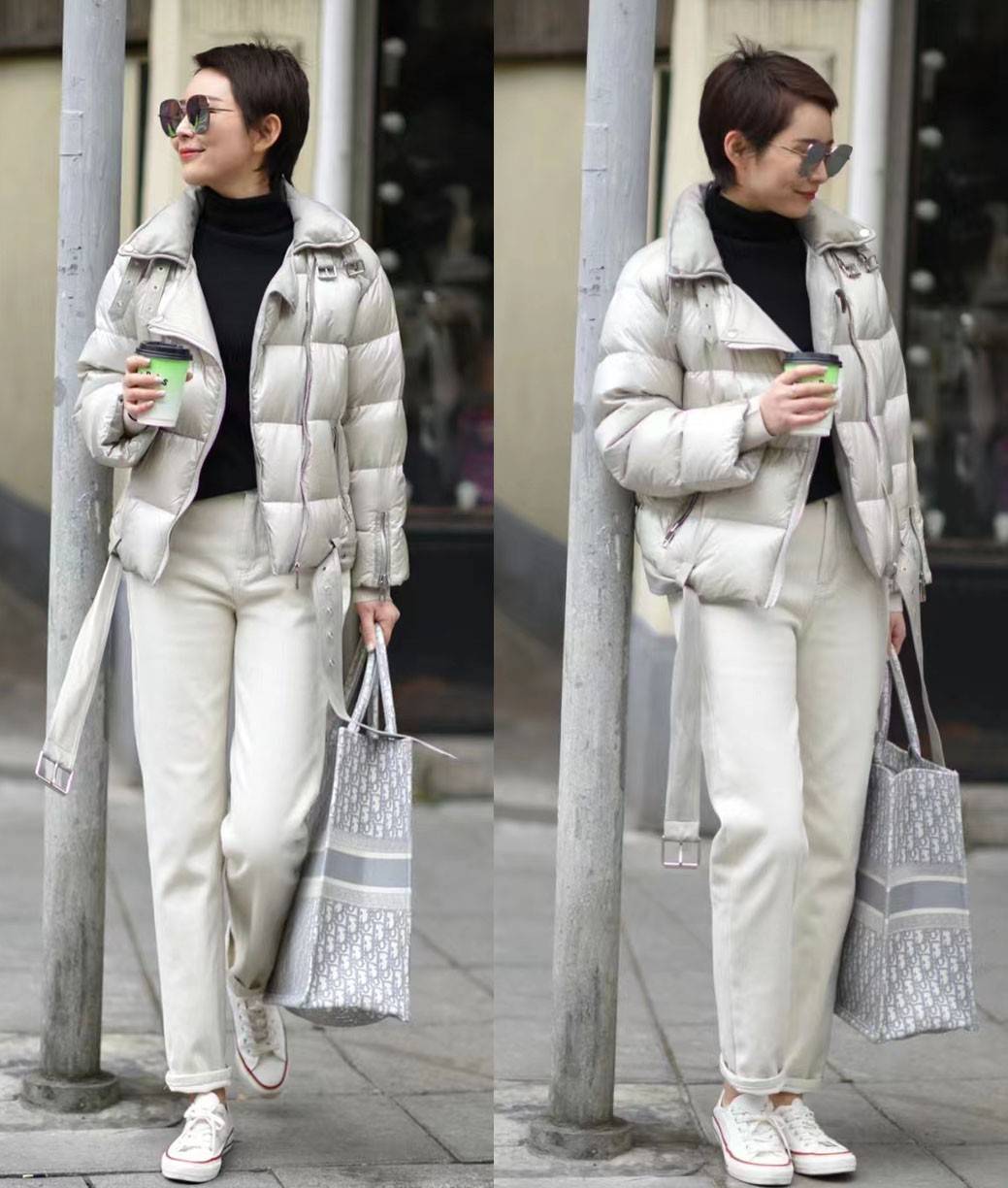 哪怕是短款羽绒服,许多爱美女性也喜欢运用紧身裤,使身姿保持更多的纤细感与利落感,但这同样也很考验腿型条件。