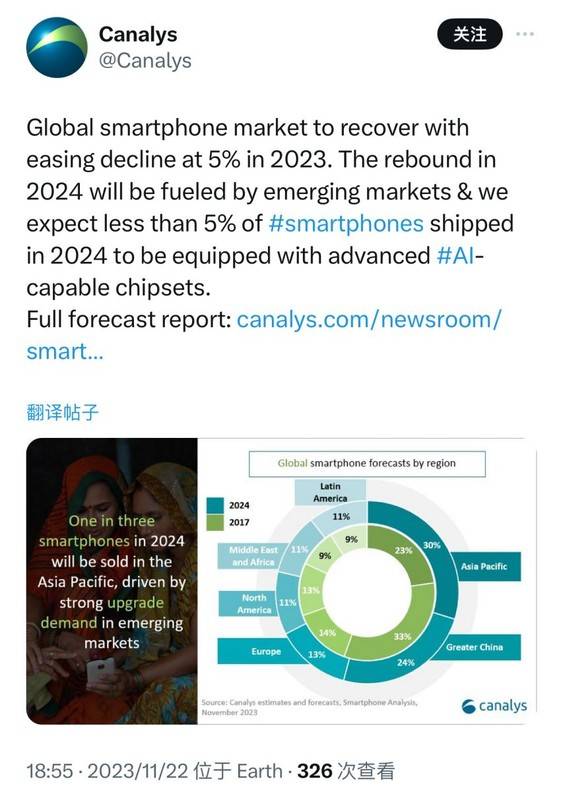 Canalys分析师Runar提醒道,目前手机设备上的人工智能能力对2024年高端智能手机的升级影响是有限的。而由于目前西欧和美国等发达市场的更换需求仍疲软,优质的智能手机的增长已经停滞不前。这些地区的优质设备真正增长周期可能要到2024年至2025年才会发生。而到了那个时候,人工智能功能才能变得足够引人注目。