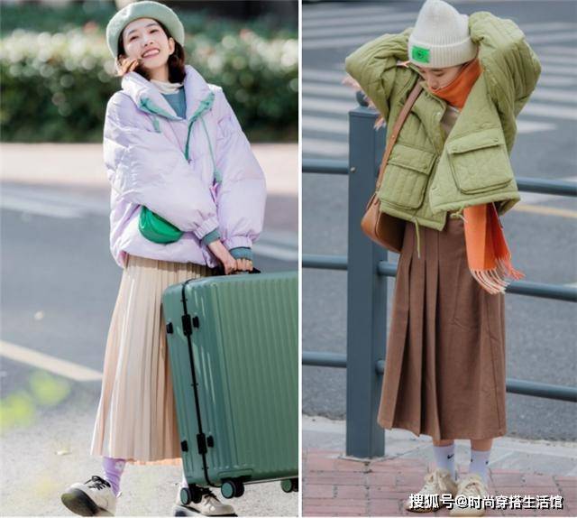 对于小个子、小骨架的女孩来说,短羽绒服+长百褶裙的搭配,利用上短+下长的组合,可以很好的呈现修长美腿。百褶裙的温婉恬静和小个子女生更搭,让这个人的气质都安静下来凸显淑女的气质。无论是与毛衣、针织开衫或者是羽绒服搭配都能轻松营造温柔文艺的气质。