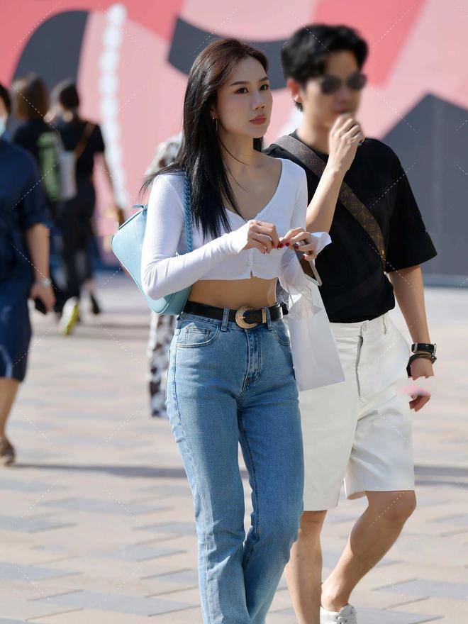短款背心搭配高腰牛仔裤,展示纤细小蛮腰的同时,更显时尚感