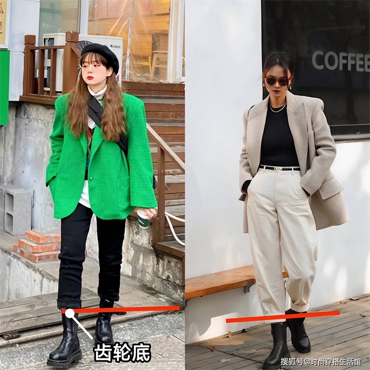 厚底款式的烟管靴选择前后具有明显高度差的粗跟或齿轮鞋底,能够缓解厚底带来的笨重感,鞋跟高度通常在六厘米以内就能达到显瘦显高的目的了,千万不要太夸张!