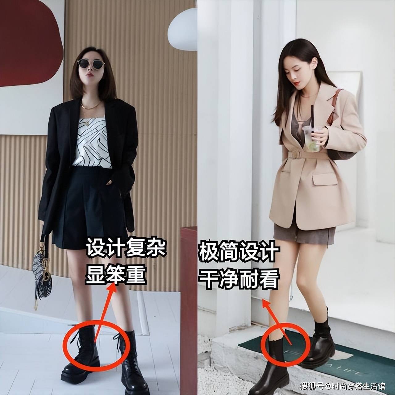 不管是长筒靴还是中筒靴,高级感的秘诀在于:宽松度!筒口的位置一定要有一定的宽松度,紧紧地包裹在大腿上的靴子特别的土。所以可以选择倒梯形的鞋型或者靴筒口采用直线剪裁的鞋型。直筒的靴子给人一种雨鞋和不合脚的感觉,走起路来拖沓笨重。贴合腿部曲线的靴子才能制造干练和帅气感。