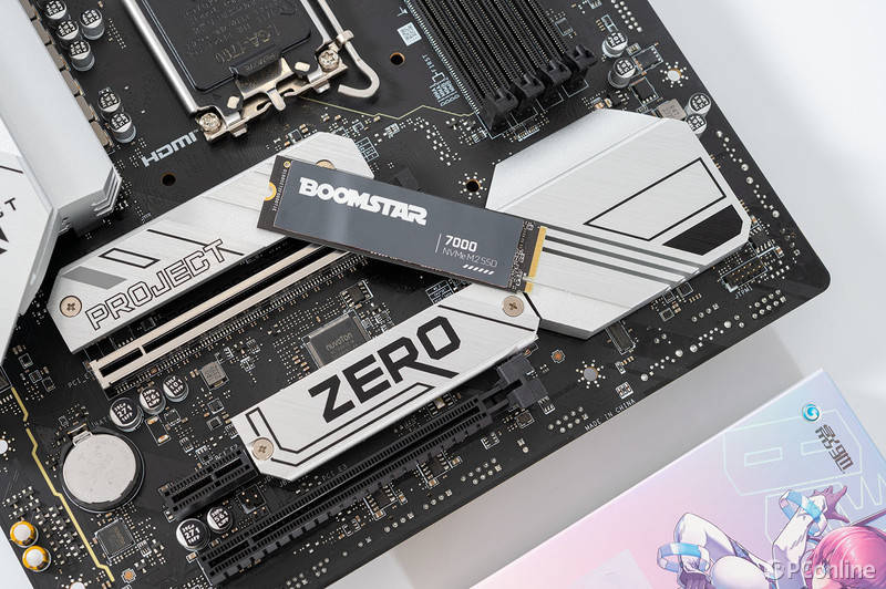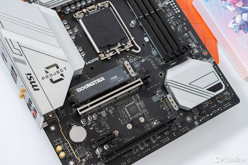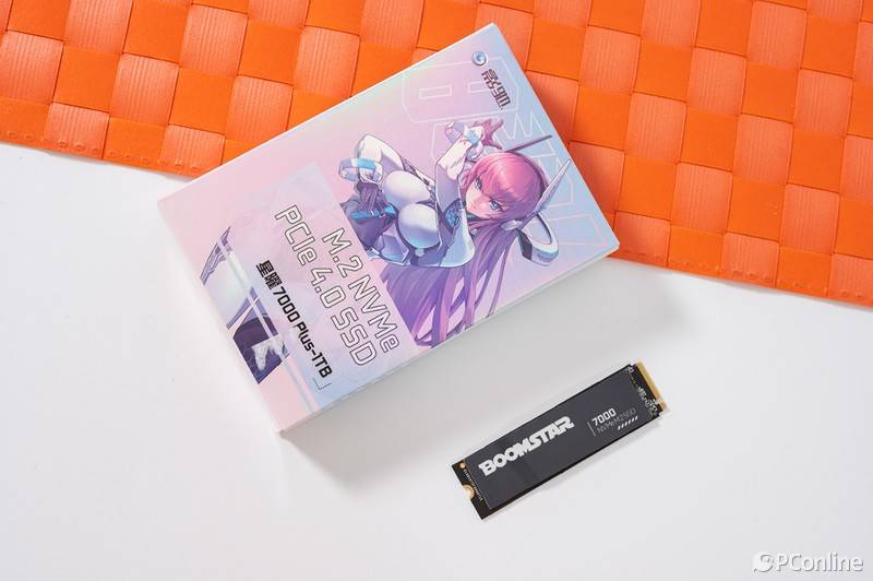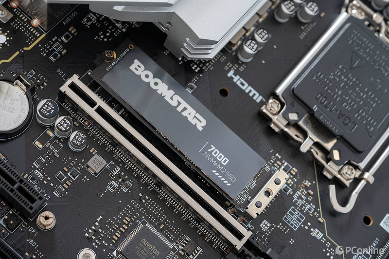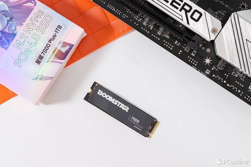 另外,固态硬盘的表面还有一层黑色金属复合材料打造的散热贴加持,上面印有星曜系列的英文名“BOOMSTAR”,与黑色的基底形成强烈对比,无论是辨识度还是设计感都相当高。
