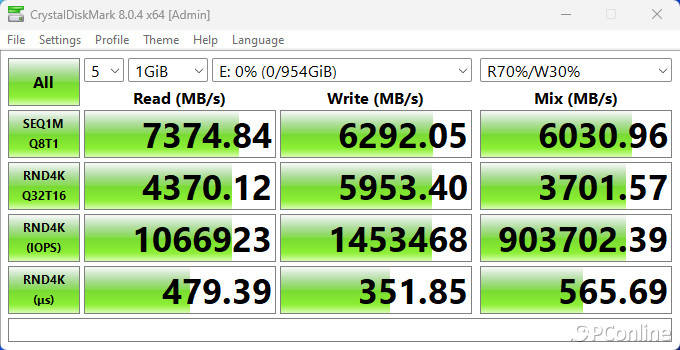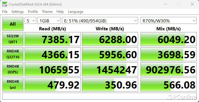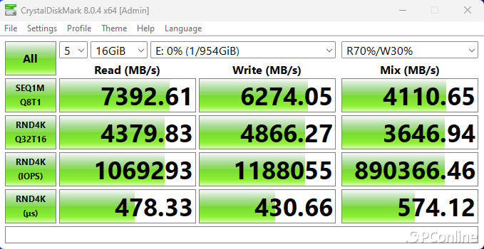 在16 GB项目中,整体性能基本没有变化,顺序读取甚至飙到了7392.61 MB/s,顺序写入则为6274.05 MB/s,即便是4K性能,影驰星曜7000 Plus也做到了4K读取1069K IOPS和4K写入1188K IOPS的傲人成绩,完全达到了PCIe 4.0时代的旗舰水平。