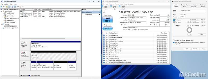 开测性能前,先用硬盘健康状况检测工具CrystalDiskInfo查看硬盘信息,我们看到影驰星曜7000 Plus 1TB固态硬盘的固件版本为ERFM11.0,传输模式为PCIe 4.0 x4,支持NVMe 1.4标准,支持S.M.A.R.T、TRIM以及VolatileWriteCache功能,硬盘在无负载的情况下,待机温度仅为21度。硬盘的可用空间为953GB,容量处于1TB固态硬盘正常的区间内。