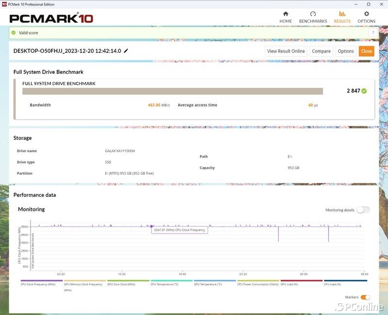 我们再来看下更侧重于办公场景测试的PCMark10测试,空盘状态下,影驰星曜7000 Plus的评分为2847,带宽463.85 MB/s,平均存取时间仅为60μs,这在我们测试的PCIe 4.0固态硬盘中也是名列前茅。