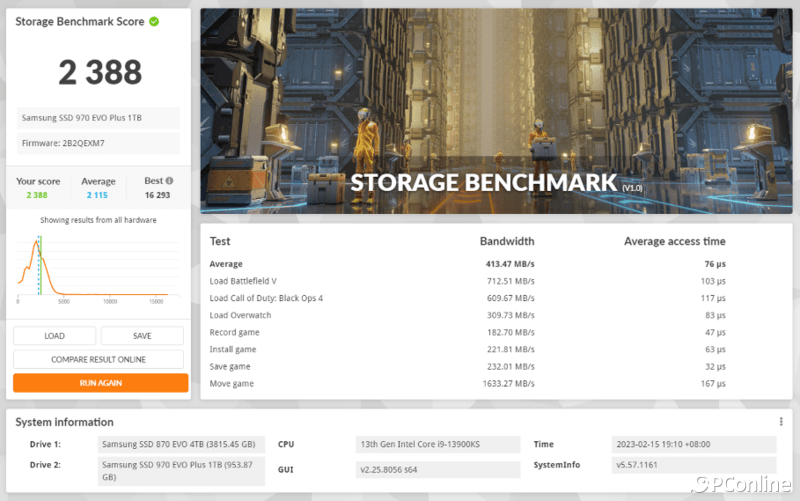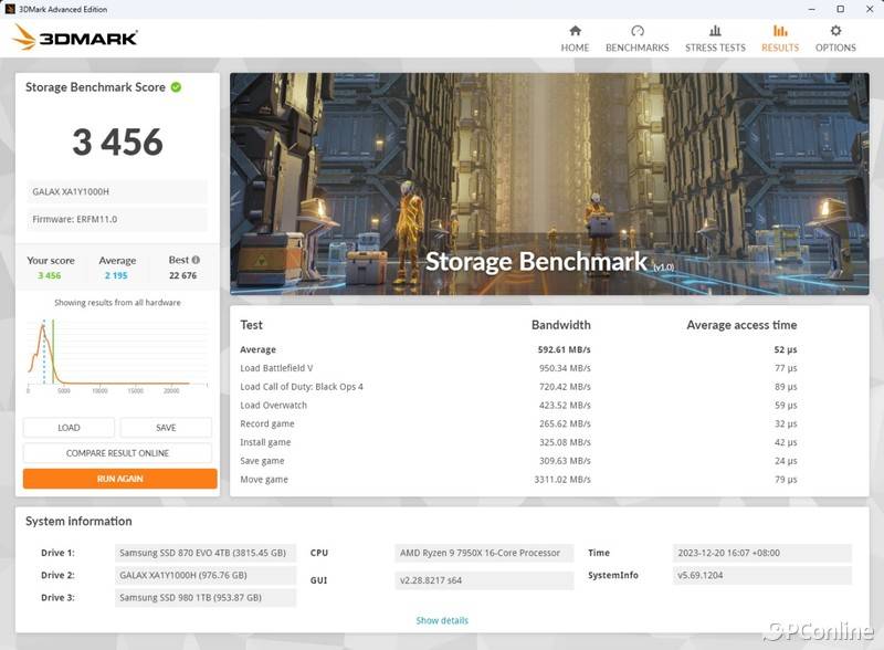 接下来,整点有压力的测试。不少玩家都是将固态硬盘作为游戏盘,在3DMARK存储基准测试里,软件会模拟各种游戏加载、安装、录制、保存以及移动游戏。而影驰星曜7000 Plus 在该测试中的总得分为3440分,平均带宽有587.13MB/s,存取时间则是52μs,这在PCIe 4.0的SSD中已经算很出众的了。