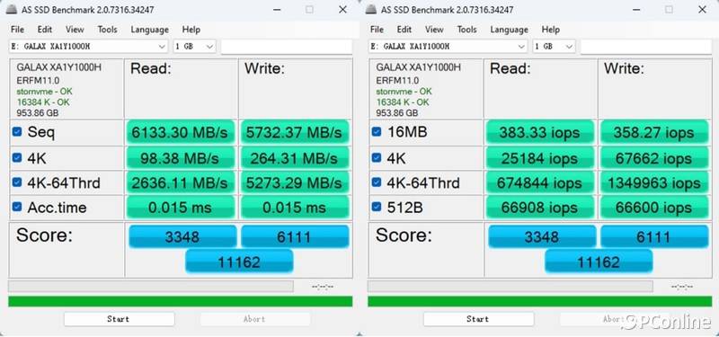 由于算法问题,AS SSD Benchmark跑分会比CrystalDiskMark低一些,影驰星曜7000 Plus在AS SSD Benchmark 1GB下取得了11162总分,其中顺序读取6133.3 MB/s,顺序写入5732.37MB/s,4K读取98.38 MB/s,写入则是264.31 MB/s。