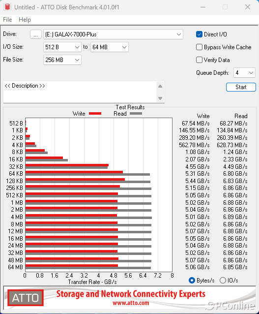 游戏、办公都见过了,那该轮到文件传输了。我们用ATTO进行模拟,在64KB数据级的时候已经能够完全释放这块固态硬盘的读写性能潜力了,读取可以达到6.88 GB/s,写入则是5.05 GB/s,这个速度对充满各种小文件的游戏文件夹来说简直是轻轻松松。