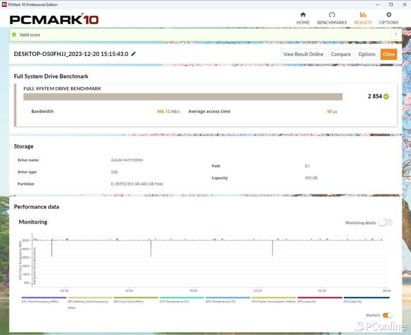 半盘状态也不虚,评分甚至更高了,达到了2854分,带宽则基本没变,466.12 MB/s的表现,可见它稳定性还是相当给力的。有一说一,这个表现依旧能够满足绝大多数游戏玩家的需要,影驰星曜7000 Plus完全不虚其他中高端PCIe 4.0固态。