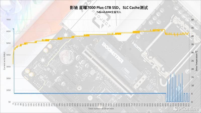 再使用TxBENCH内的高级测试,对影驰星曜7000 Plus进行全盘写入,测试其SLC Cache的大小与存储策略。