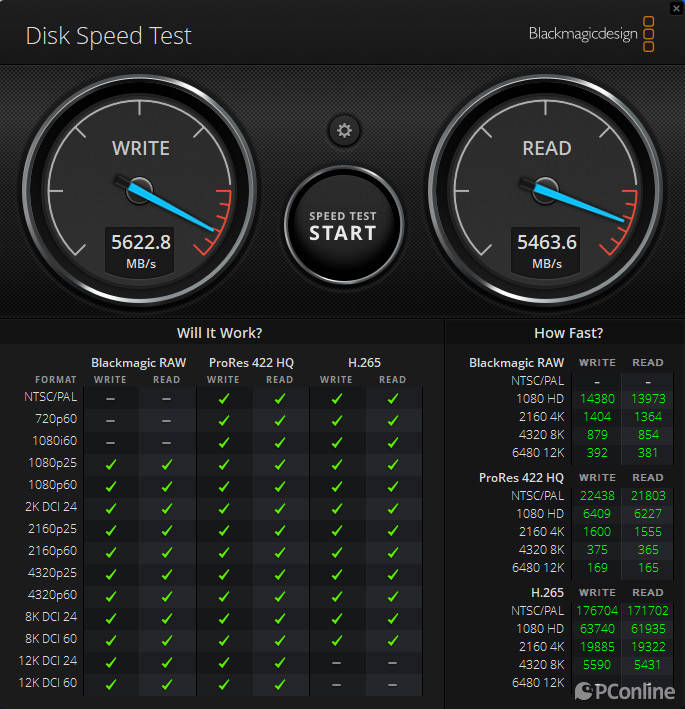 当然这块固态当作素材盘也是没有一点问题,我们用DISK SPEED TEST测了一下,这块固态硬盘的读写性能分别为5463.6 MB/和5622.8 MB/s,而且对各种格式的都有良好的支持,选素材盘买它准没错!