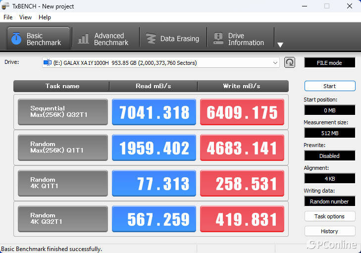 紧接着,我们使用TxBENCH进行读写性能测试与 SLC Cache缓存测试,基准测试所得到的结果也和其他同类型测试结果相类似,测试状态下的读写速度分别为7041.318 MB/s和 6409.175 MB/s,这个读写成绩也远超官方宣传的读写7000 / 6000 MB/s。