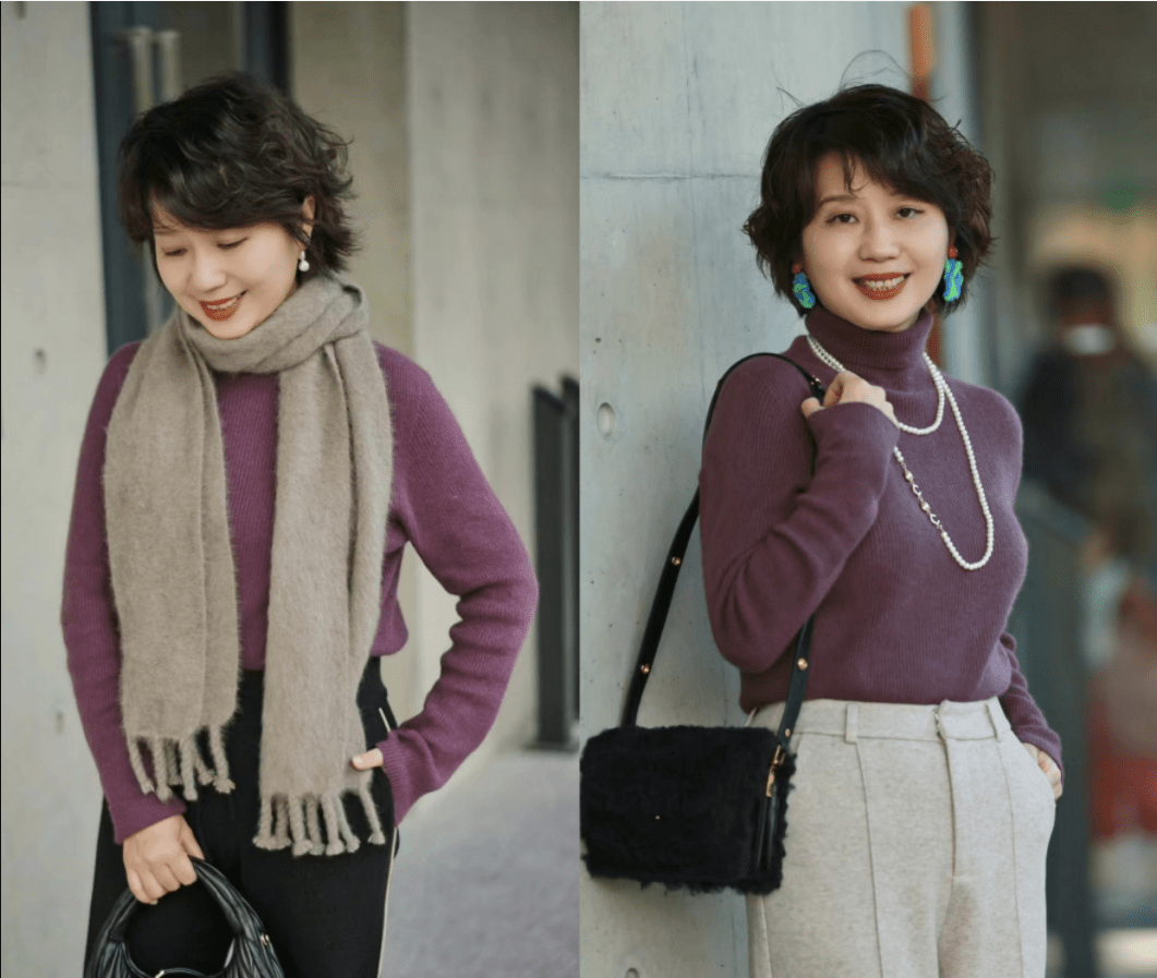 如果不喜欢紫色的外套,还可以尝试一下紫色的高领针织衫,尤其是这款颜色偏暗的紫色单品,它可以彰显出女性成熟的形象,沉淀出来的个人风采也会温柔知性。
