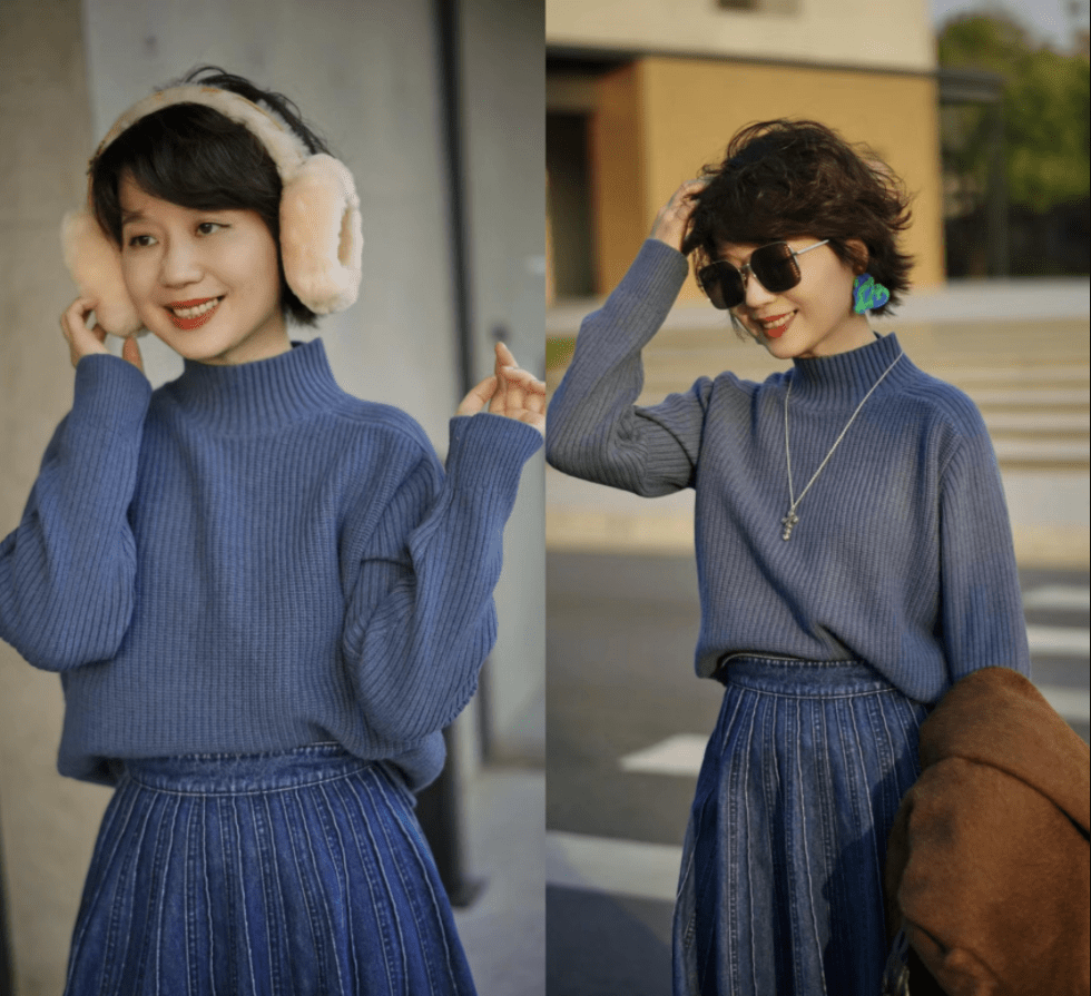这位女士选用的是蓝色的毛衣和过膝半身裙的搭配,两件蓝色单品之间的契合,将会让整组造型的统一感更强,看着更加清爽大气。