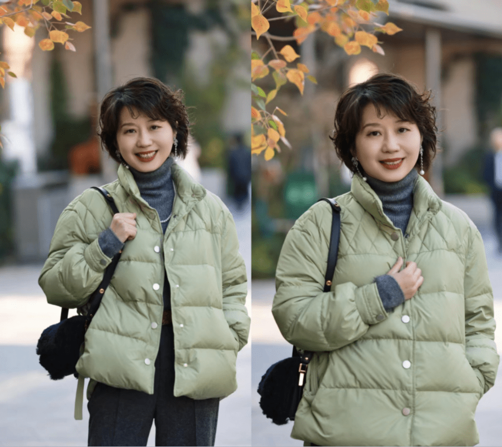 好比这件绿色的羽绒服,它的存在让整个画面都变得很有活力。与此同时,这位女士还在里面搭配了颜色偏深的高领打底衫,让色彩之间更有一种过渡,看起来也颇为高级。