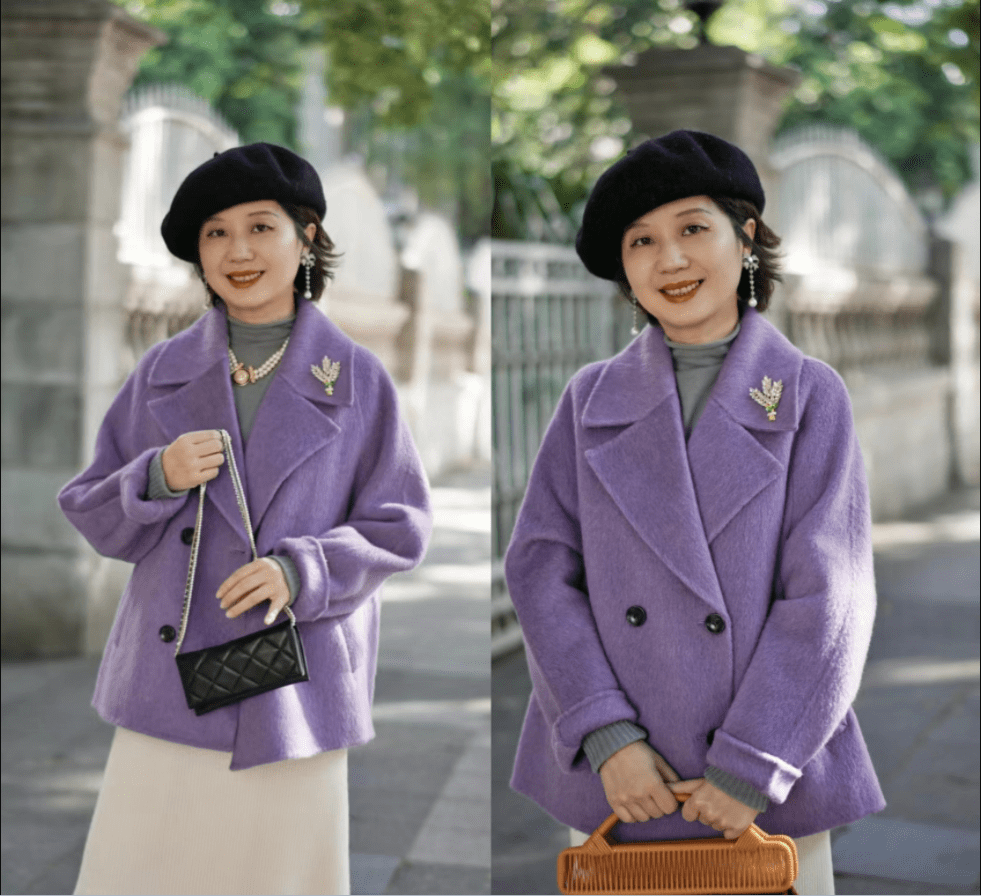 冬天还是比较适合穿彩色单品的,这是因为这种服饰可以放大生动的气息,而紫色的服饰可能很容易帮助四五十岁的女性打造出温柔的风采。比如这件紫色的大衣,就值得所有的大龄女性尝试,大方又没有视觉上的压迫感。