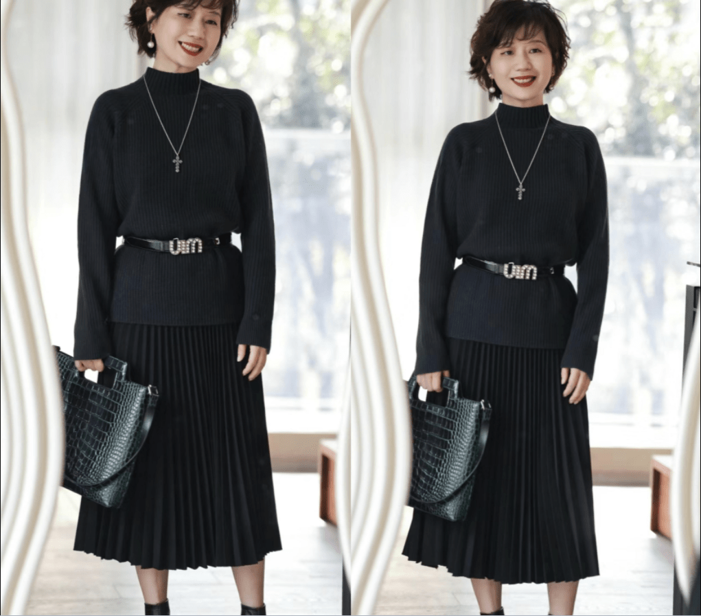 进入到了冬季之后,大家可以多穿裙子,让自己的气质更出彩。比如这条黑色的百褶半身裙,颜色永远不过时,搭配黑色毛衣,让身材轮廓变得更紧致,结合腰带,让体型显得更加窈窕。