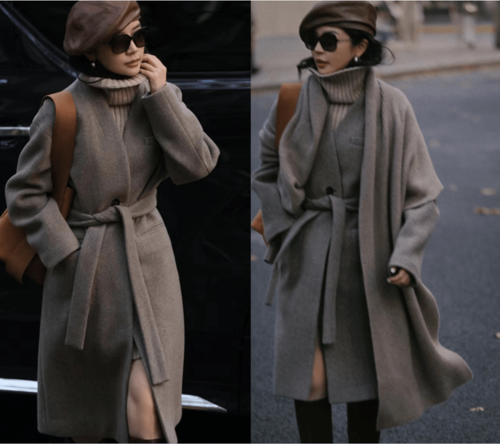 比如这件长款大衣,可以直接采取腰带进行收缩,这样展现出来的身材曲线,会更加的清晰。