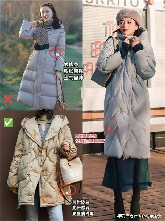 若是腰身不够纤细,尽量放弃收腰效果明显的修身版型,选择腰线位置较高,且松紧有度的羽绒服版型;即便是喜欢松垮感的女性,也不能选择腰身太松的款式,尽量以高腰线、松紧适中的羽绒服为首选。