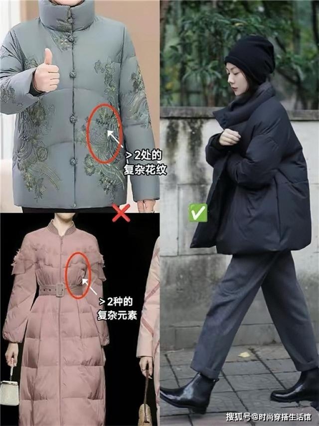 款式过于繁杂的羽绒服会给人感觉比较拖沓。羽绒材质填充的衣服本身就比较厚实,如果款式过于复杂的话会让人感觉更加臃肿,完全没有美感。