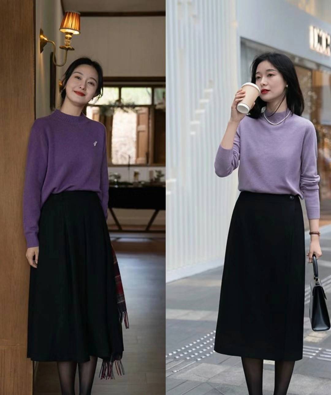 比如紫色的毛衣,它的整个色系渲染十分的浪漫柔和,穿在身上,也可以彰显出极为温婉的气息。大家可以选择葡萄紫色,成熟一些,也可以运用浅紫色,稍微的减龄一点。