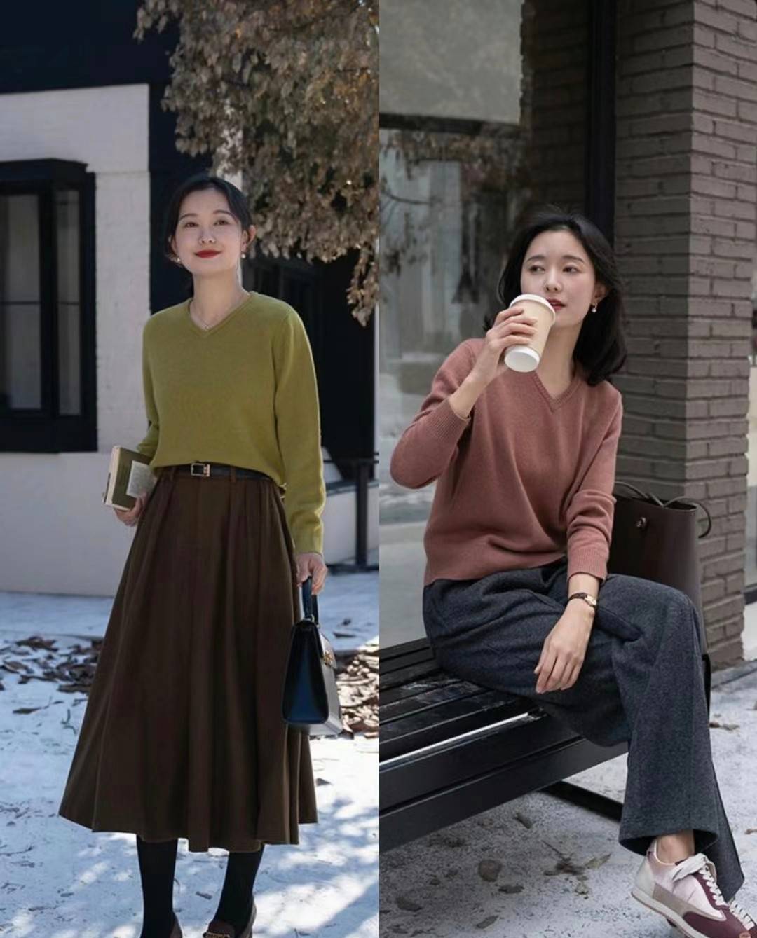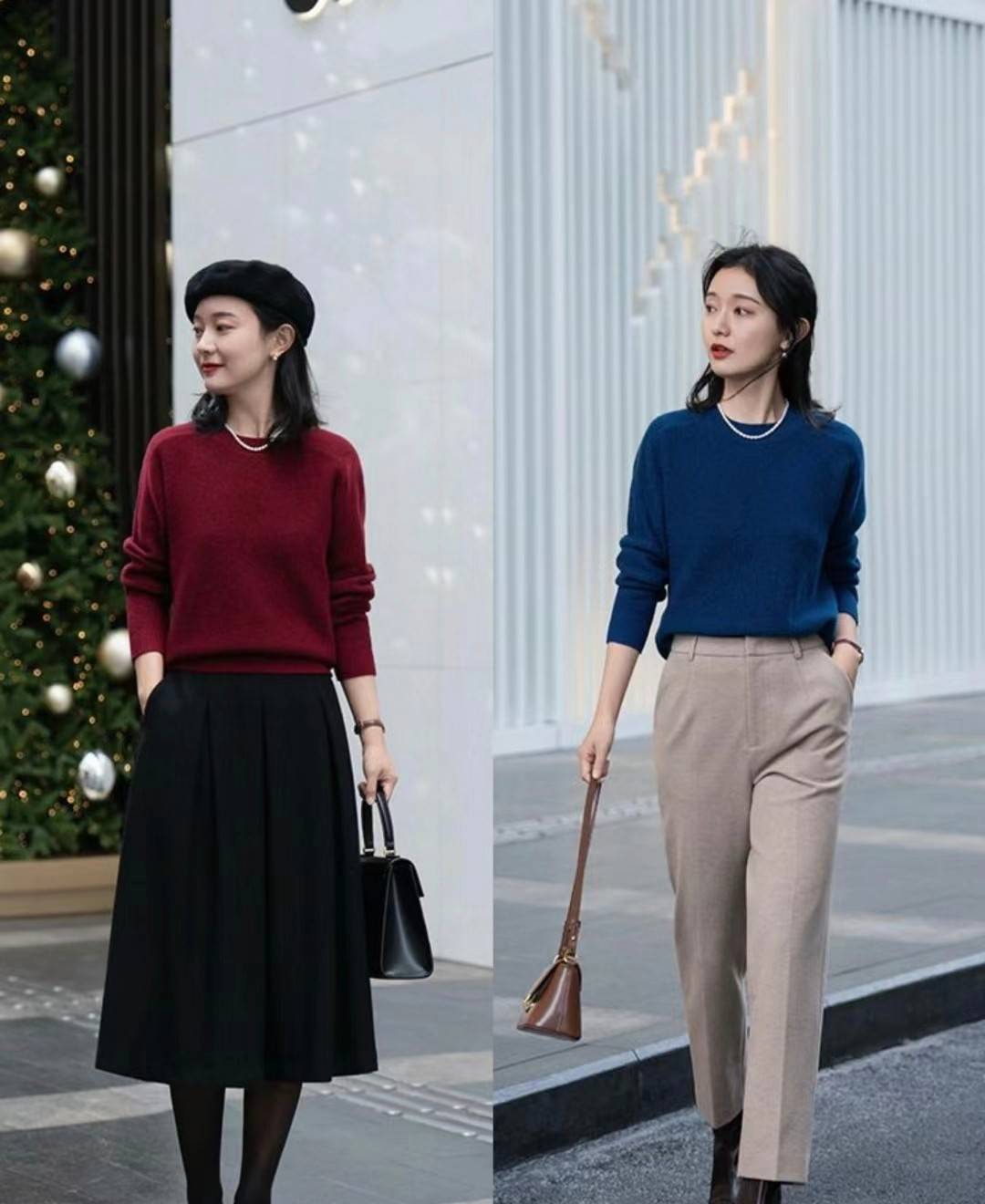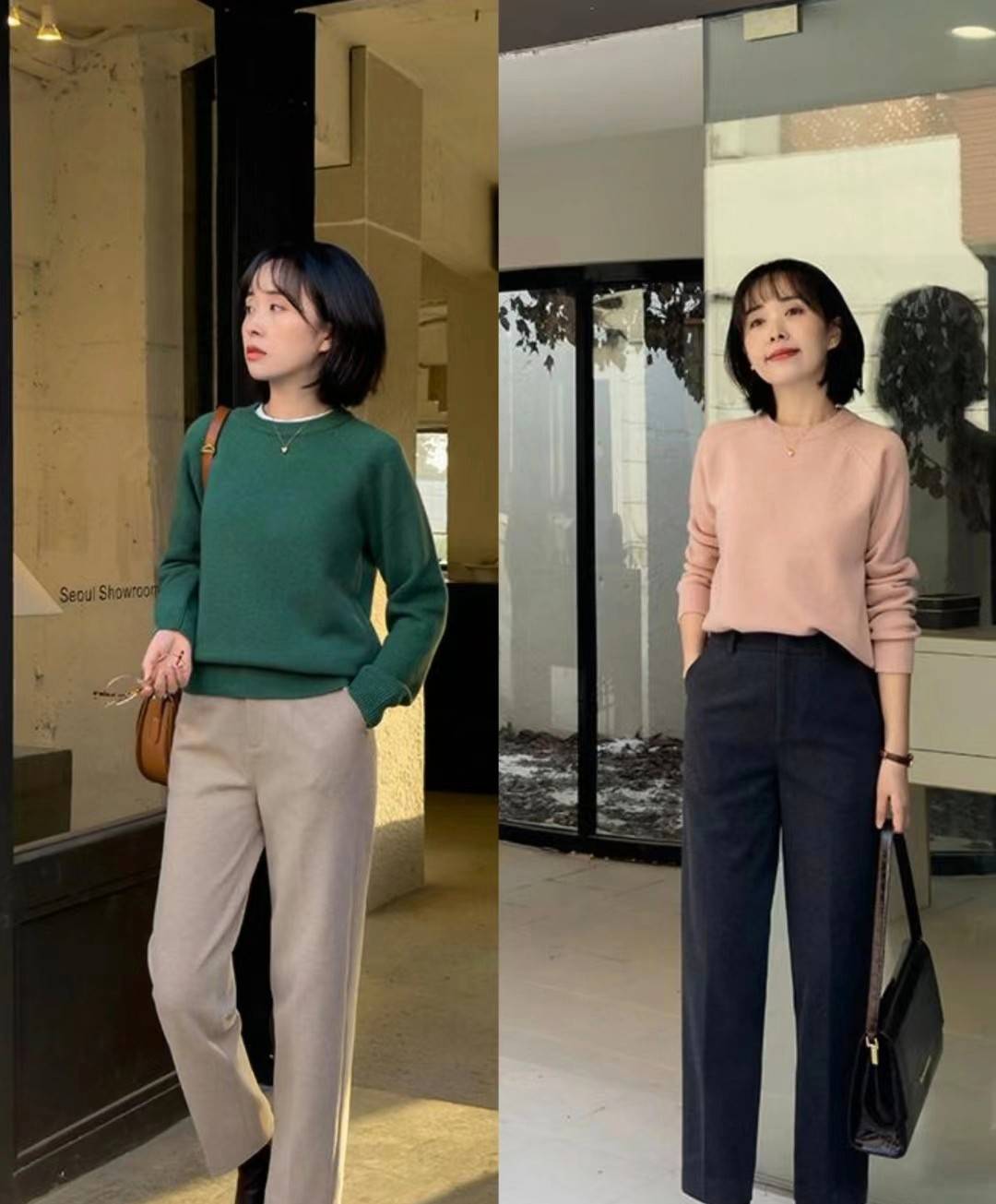 这两件彩色的毛衣,都搭配了颜色简洁又百搭的西装裤,可以将腿部进行修饰,呈现出不错的显瘦效果。