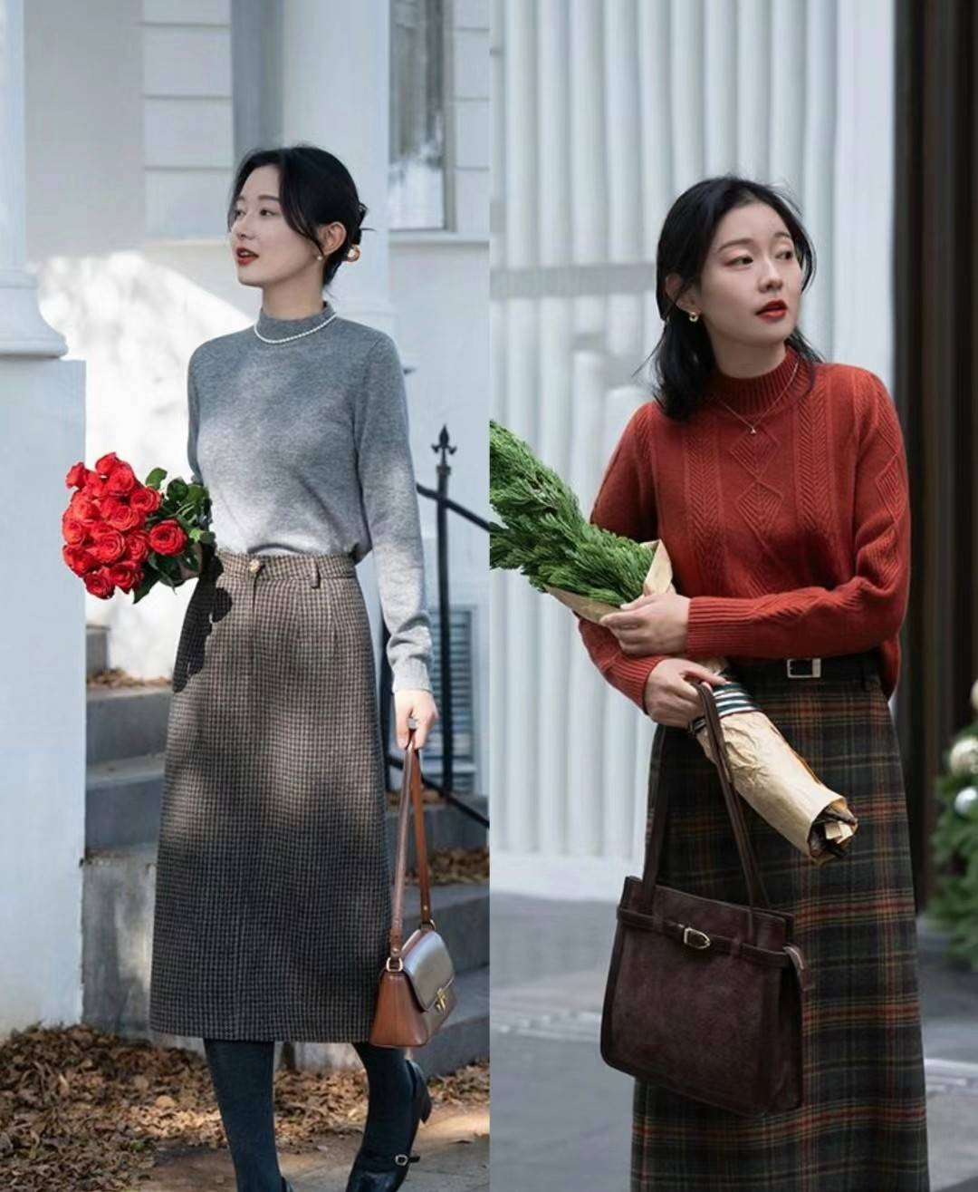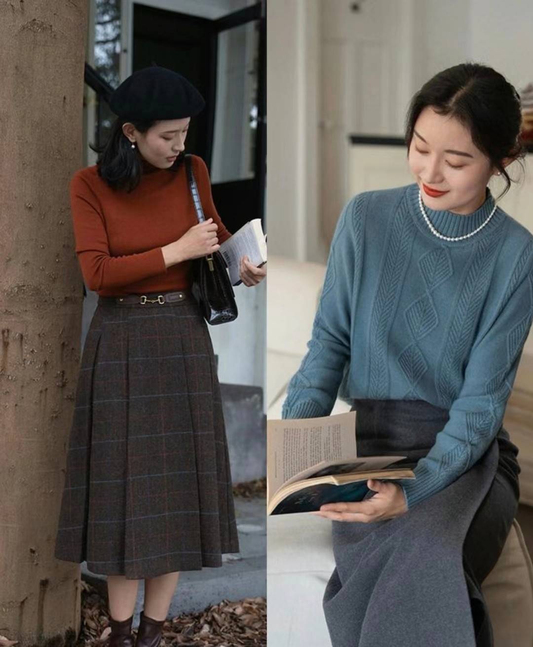 这两款毛衣就结合了不同样式的裙子,但不管是哪种设计,都是没有驾驭压力的单品,天气冷的时候,穿上打底裤,就不会太单薄。