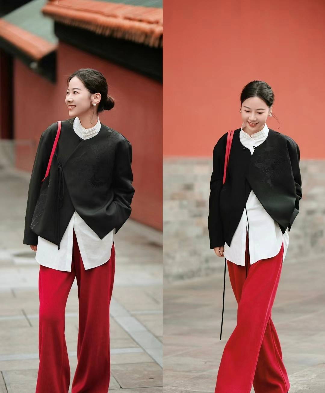 除了红色的内搭之外,大家也可以适时的加入一些大红色的裤装,整个人的气场更充足,打造出来的穿搭更加新颖。