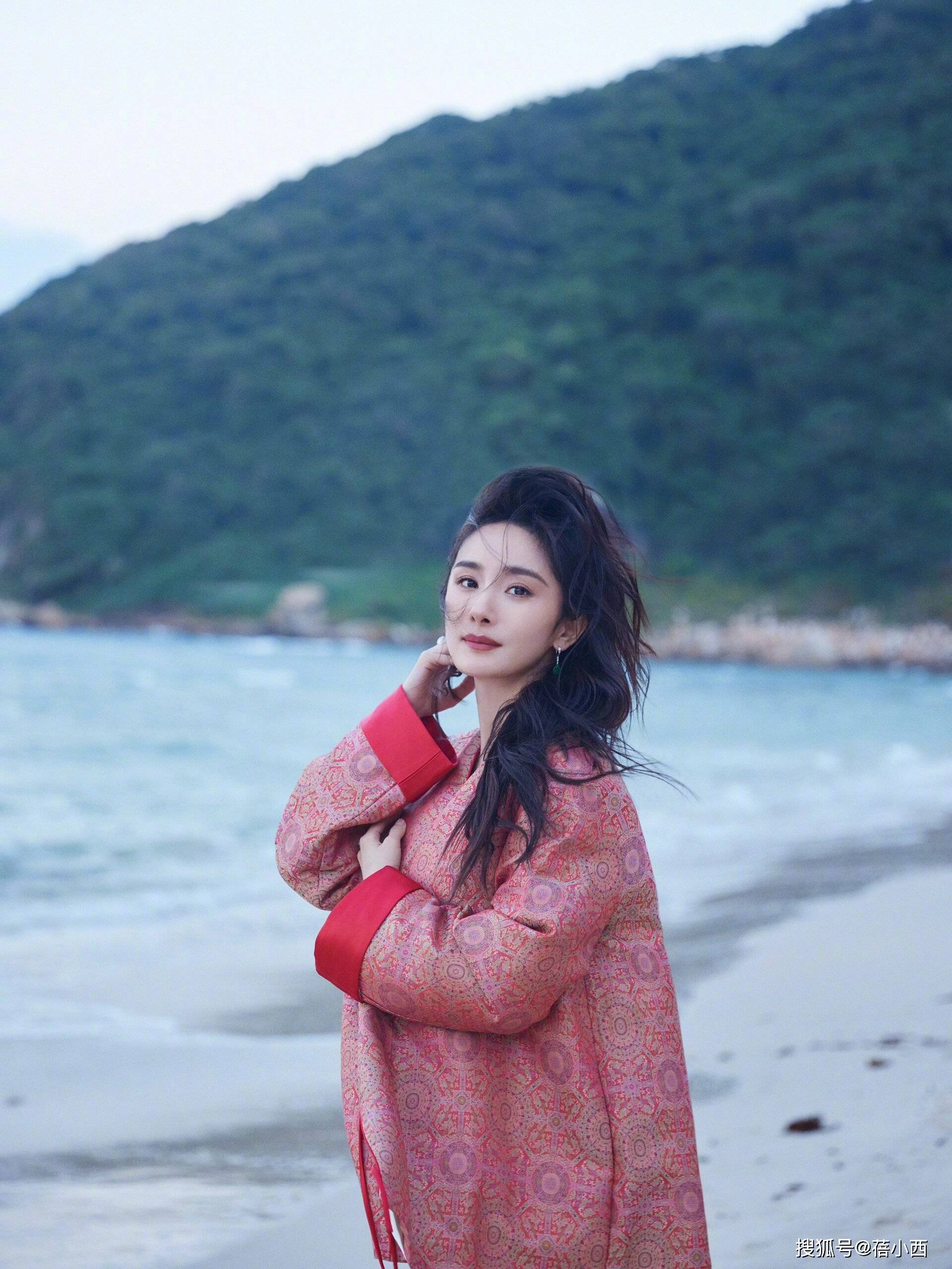 杨幂在海边带火了一种新中式穿法:宋锦+吊带睡裙,美艳又高级