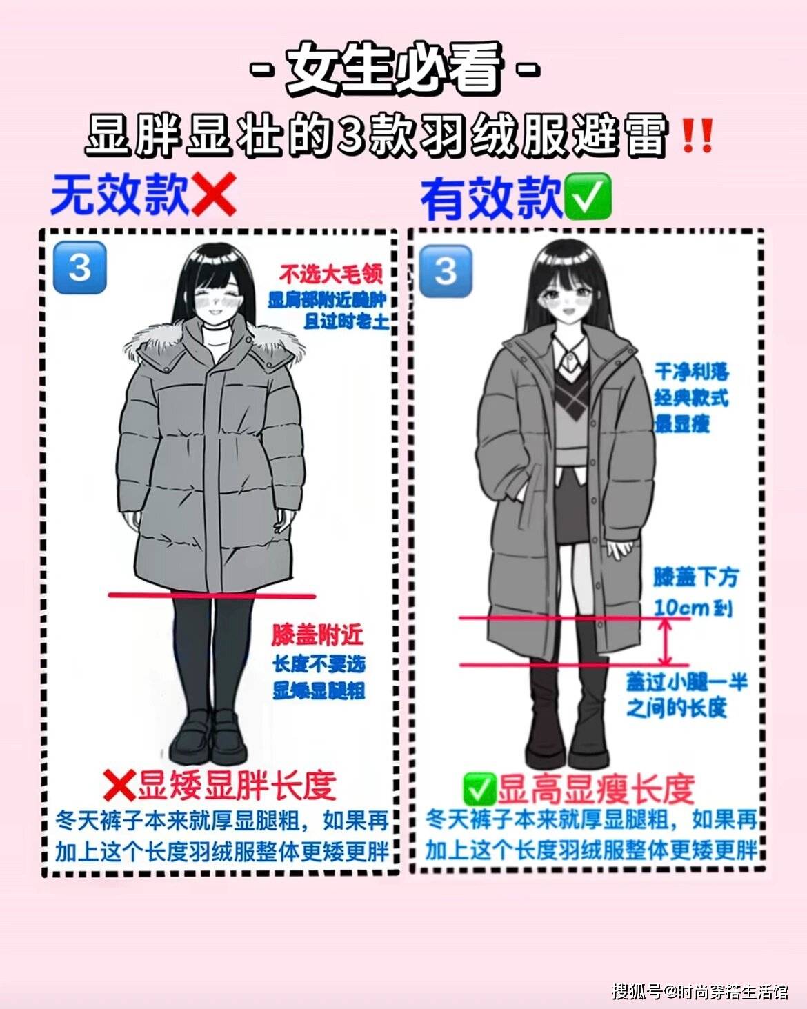 到冬天的时候,大家觉得长款的衣服显瘦效果比短裤的衣服更好一些,所以在平时就很喜欢去尝试那些比较长的羽绒服。 超长款或者拖地裤的羽绒服,虽然看上去确实要比短裤的羽绒服更加保暖,但这种长度穿上身之后也会显得非常拖沓。而且冬天的裤子本来就后显腿粗,如果再选择这个长度的羽绒服其实会让整体的穿搭更加显矮显胖。