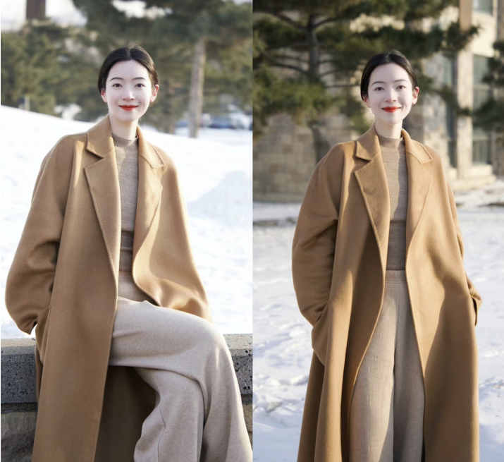 尤其要隆重推荐这件带有腰带的燕麦色长大衣,从颜色的角度来评判,它是一款看起来温和且较为百搭的服装,显得女性从容而又有温柔感。从服装的版型来评价,有腰带的收缩,对曲线的描绘有益。