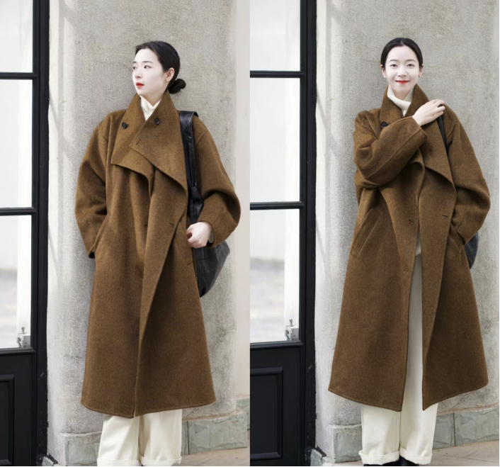 这款棕色的长大衣,也被成熟女性所喜爱,但与此同时,它体现出来的暗度明显一些,最好搭配一些浅色的裤装。