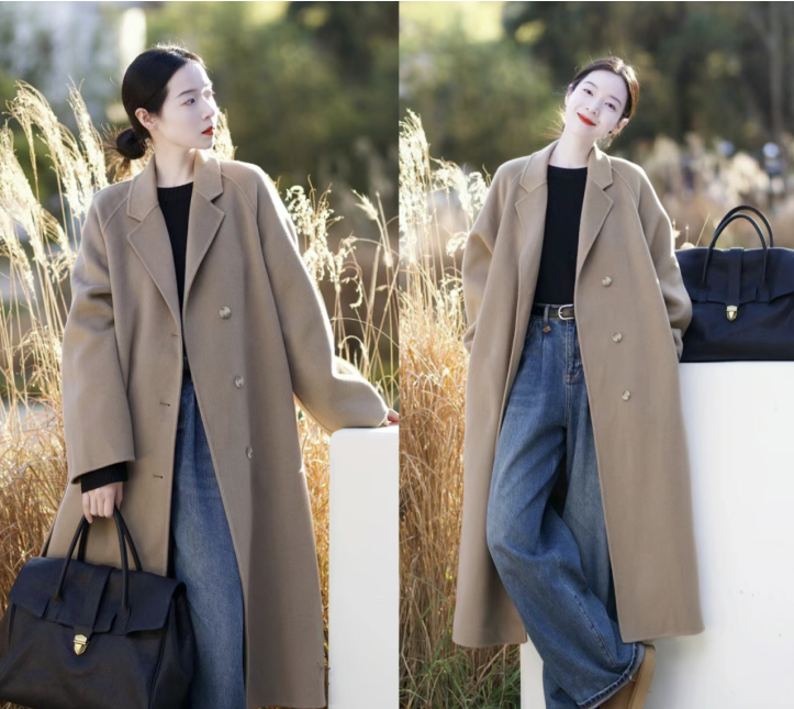 像这条驼色的长款大衣,它就结合了燕麦色的长裤,用两种大地色的搭配,谱写出温和又知性的风格。