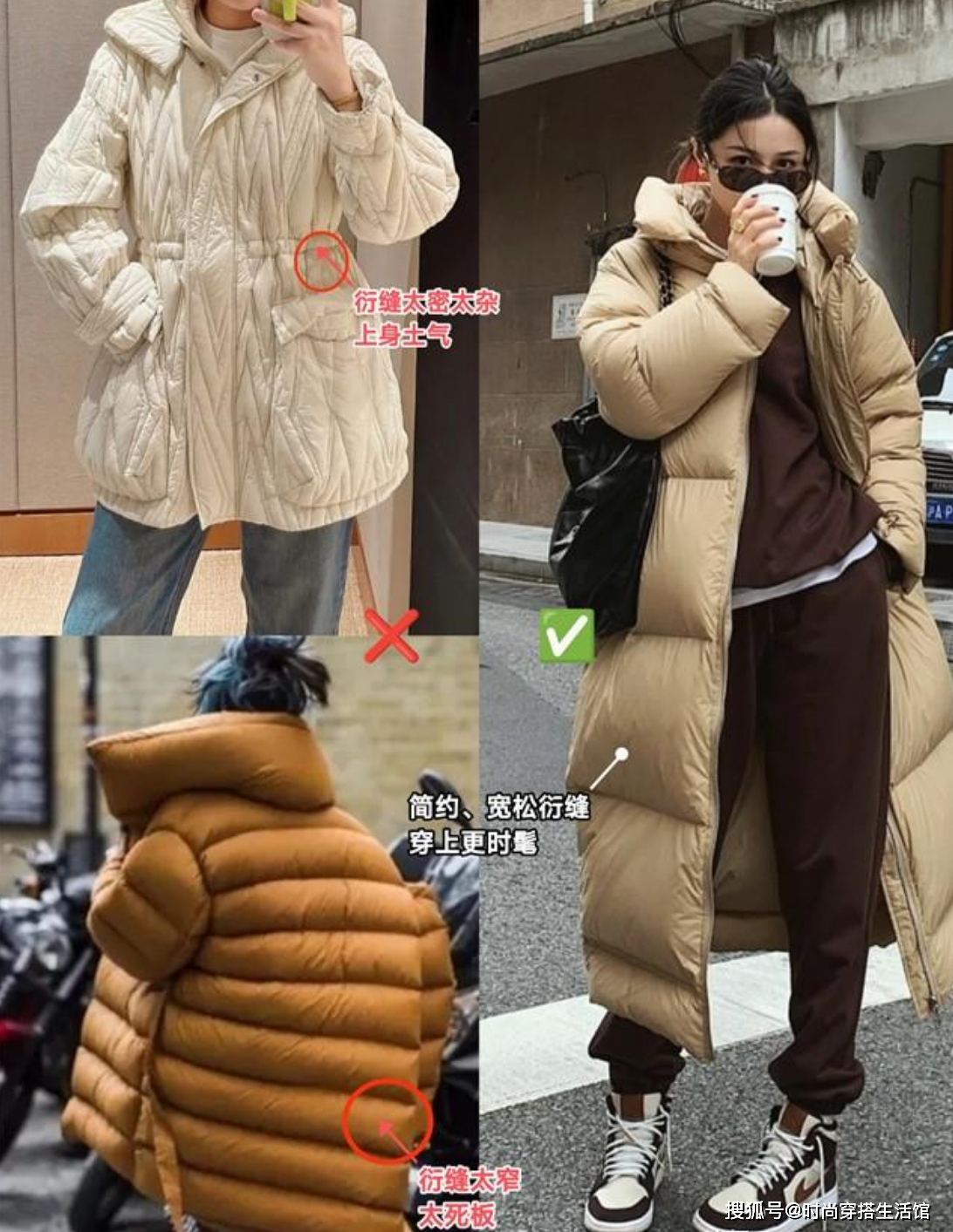 羽绒服本身款式比较厚实容易显得臃肿,而若是款式没有选择对,还会显得土气肥肿。尤其是一些小的细节设计上,比如说绗缝设计,绗缝设计本身是为了固定内胆,但如果太过密集,服装看上去就非常局促,而且还容易显得俗气。