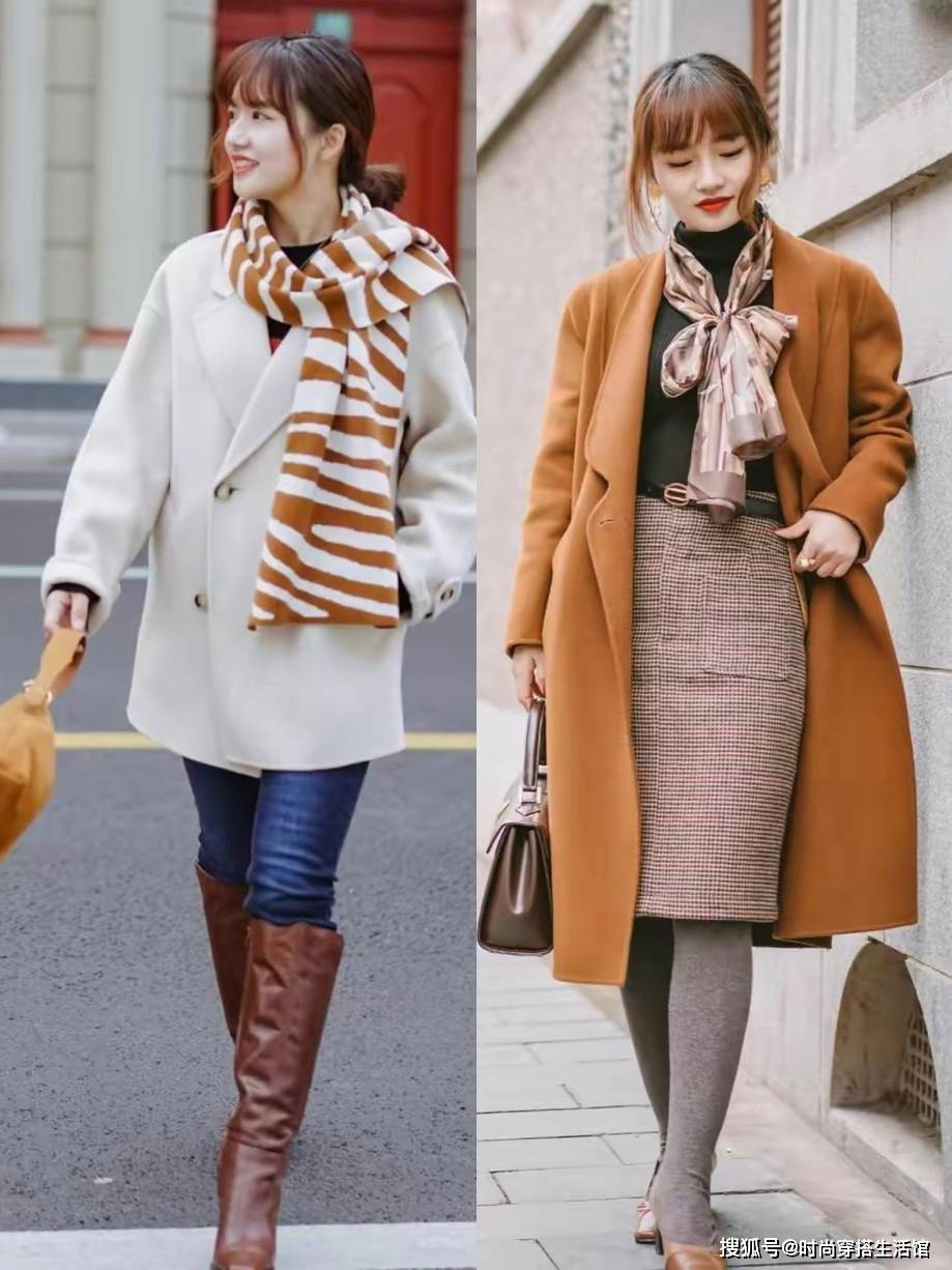 秋冬的衣服厚重,如果使用一些项链、耳环之类的配饰,在穿搭中很难出彩,这时就要运用一些体量感较大的单品,才能亮眼一些。像图中这位博主搭配的丝巾,丝绸材质光滑亮丽,打成蝴蝶结的样式,则为整体添了几分甜美优雅。