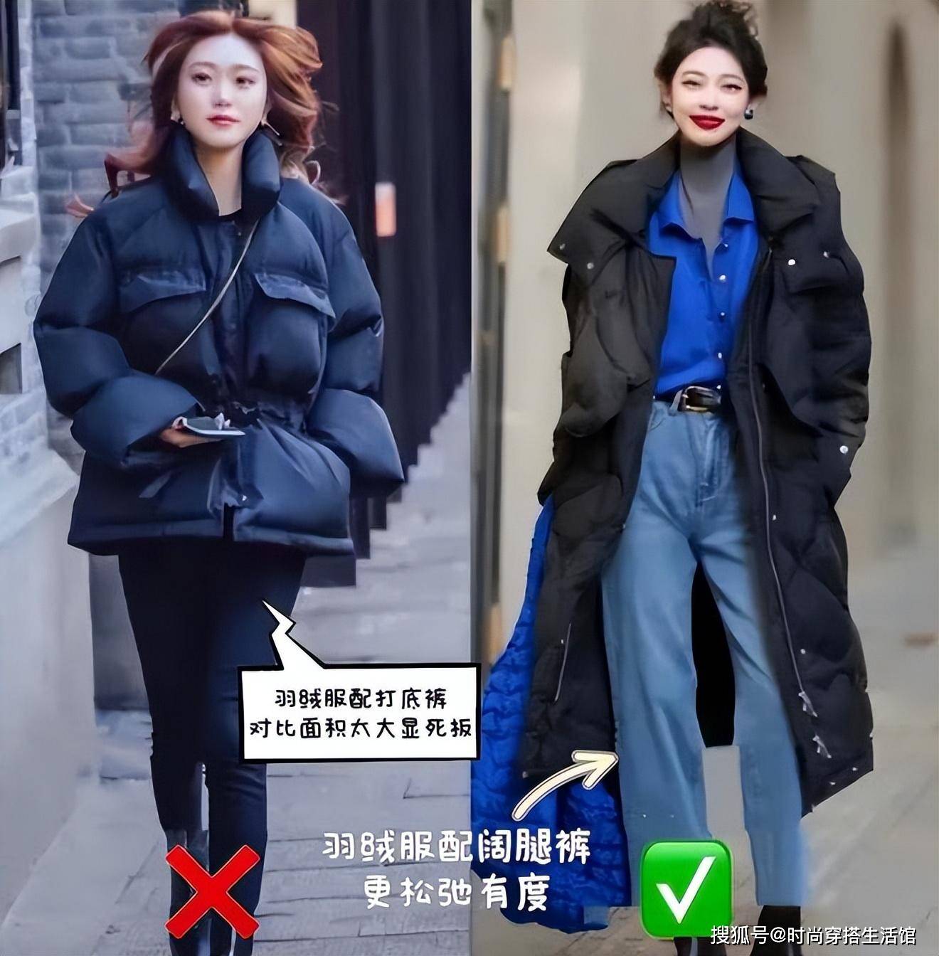 其实,我们只需要将一者的优势发挥出来,并且采取措施凹出高腰线,就能有效预防上述缺点的显露。选择中长款羽绒服搭配上针织阔腿裤的方式,使得羽绒服占比面积>阔腿裤,让大众的视线都集中在羽绒服上。