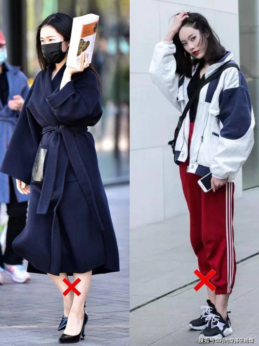 靴子的靴筒将部分腿部线条隐藏,和裤子不同的颜色还会产生截断感,产生“吃腿”的情况显腿短。不妨靴子和裤子直接选择同样颜色的,避免截断感。