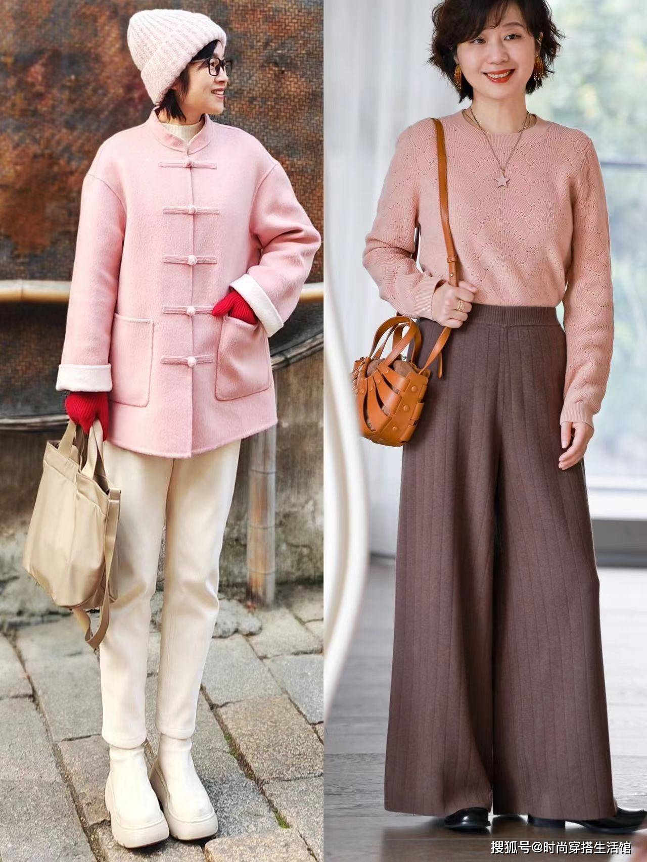 在所有的粉色系中,裸粉色是最符合中年女性的气质的,这个颜色属于低饱和度的浅色系,因此不会有太强的少女感,同时可以借助其它的深色系进行搭配,缓和整体的视觉观感,不仅能够丰富层次感,也更能起到显白显气质的作用。