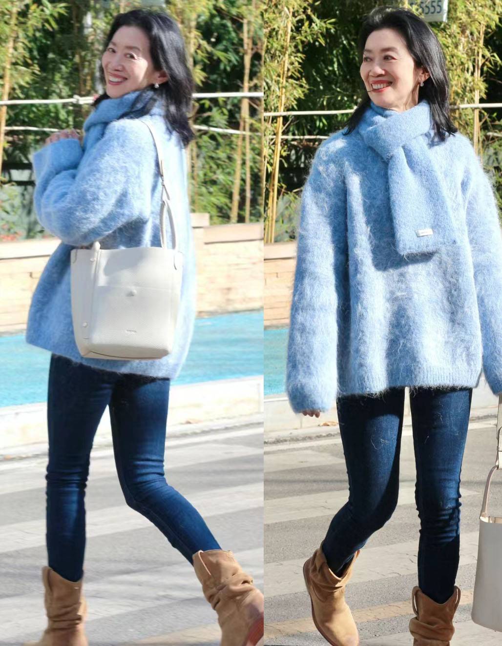 像这件蓝色与柔软面料搭配设计出的毛衣,演绎出的风格就十分治愈又养眼,可以瞬间打破冬天沉重的画面。而宽大的设计样式,除了用来实现遮肉显瘦的作用,还可以与紧身裤形成宽窄对比,从而使舒适感与利落感兼得。