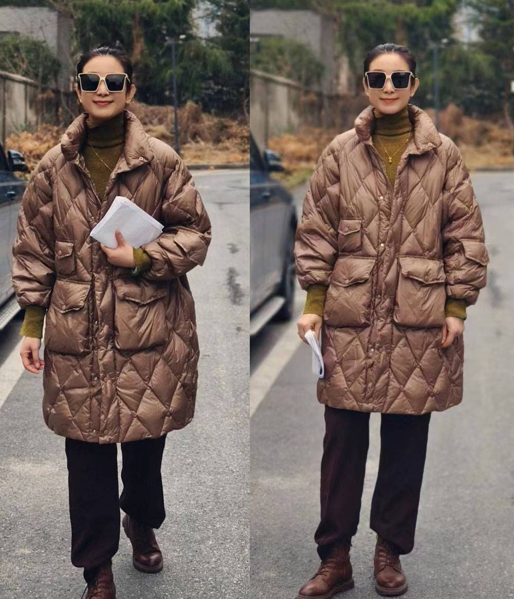 像这件中长款羽绒服,棕色加持了整体的稳重感,看起来比较符合中年时代特有的气质,因为面料的缘故,外观往往很难避免臃肿的蓬松感,因此选择修身长裤搭配,也是为了平衡出耐看的协调效果。