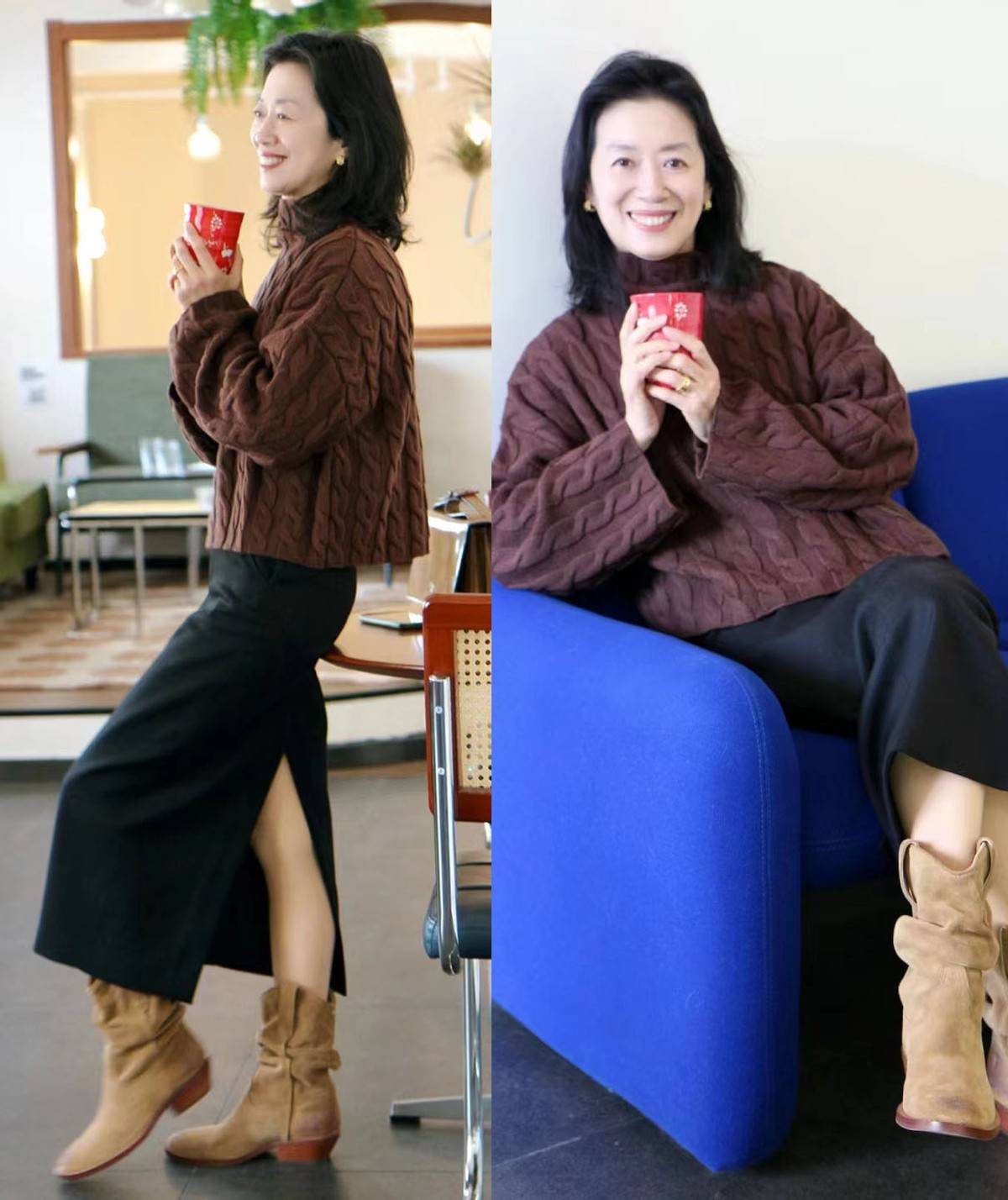 黑色或许是与冬季外套结合频率最高的色调,但也会因此丧失一些辨识感,中年女人不妨偶尔试试棕色款,更彰显氛围感。