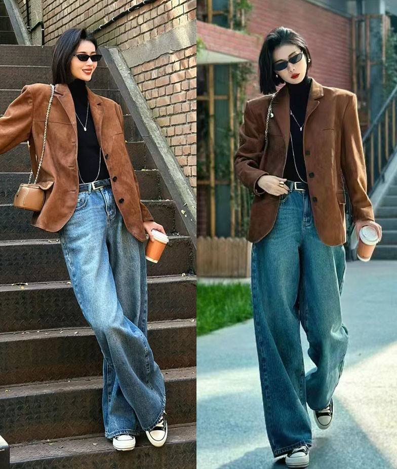 蓝色牛仔裤一直是清爽感的代名词,但因为面料比较粗糙立体的特点,与图中这件棕色外套也能形成几分呼应感,看起来又清新又帅气。
