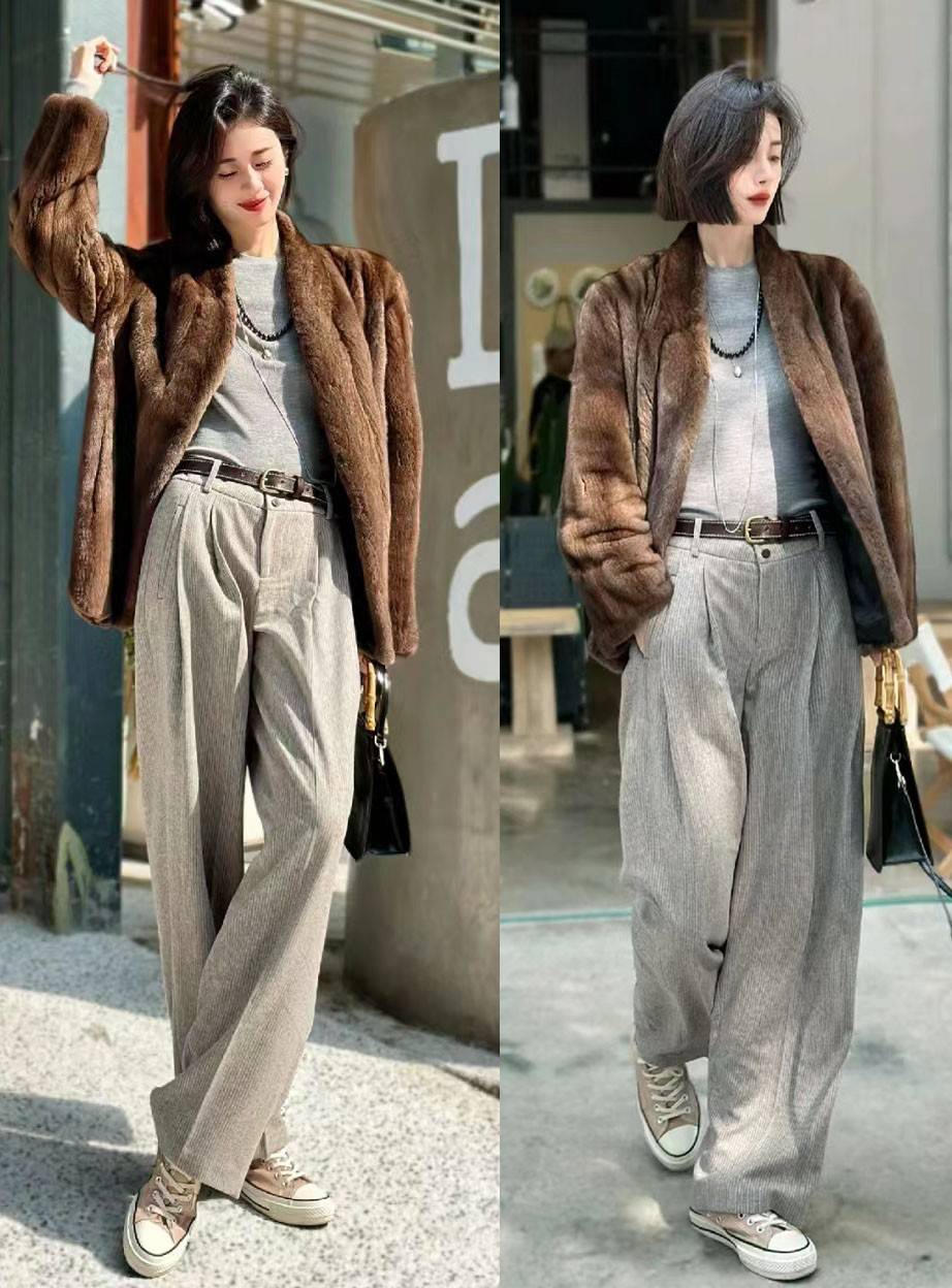 图中这位博主的穿搭就十分保暖时髦,上身运用的是棕色羊羔绒外套,配合宽松版型,十分凸显大气风范,与宽大的西裤叠加,也稳妥的保持了这种时尚风格。