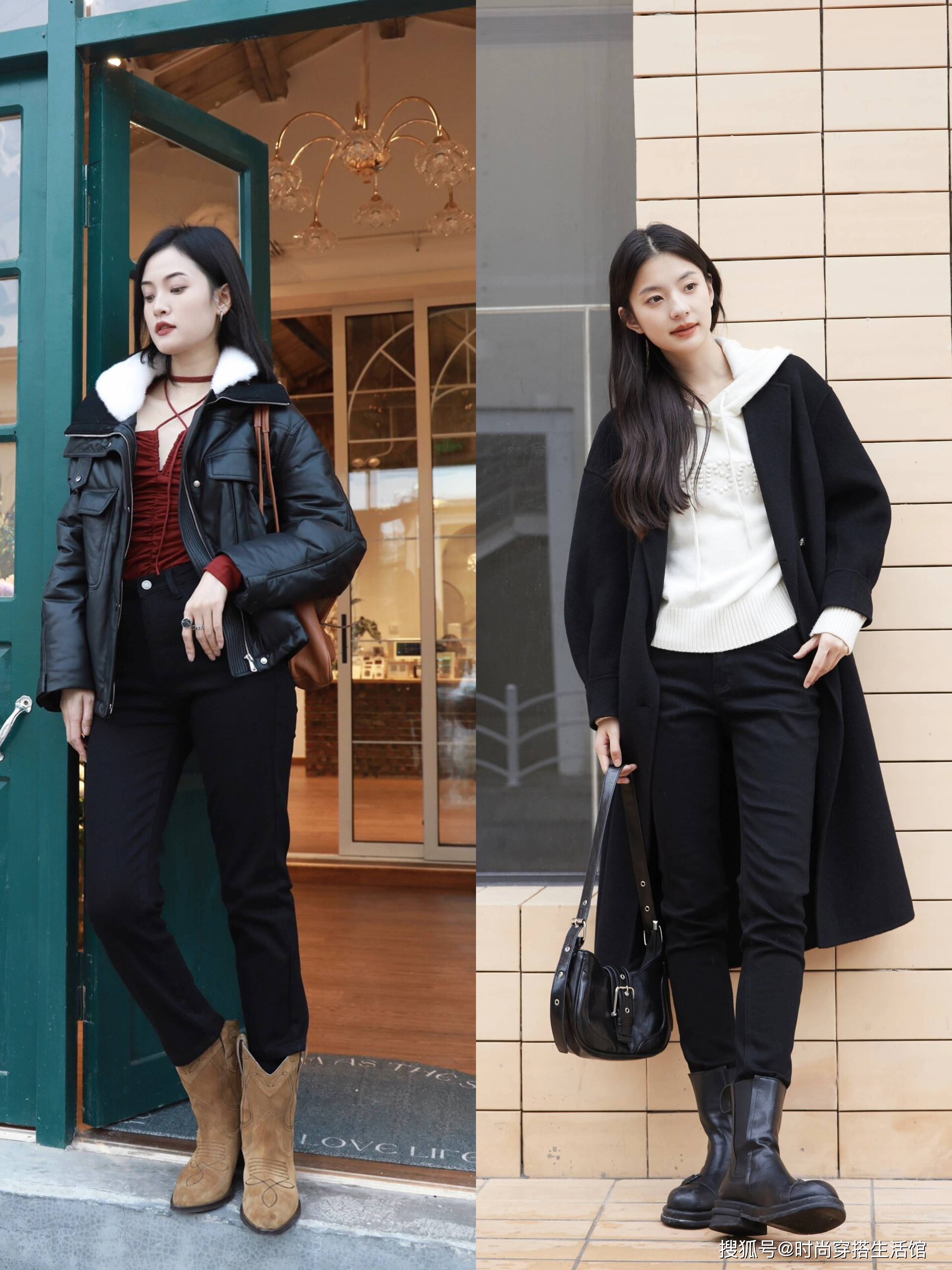 在穿羽绒服时切记要保持适度的露肤感,这样可以避免穿出拖沓沉闷的效果,让搭配质感更上一个台阶。可以参考上图选择“短靴、中筒靴+九分裤”的组合,这样的搭配既保证了搭配的轻盈感,也兼顾了保暖性,实穿又时髦,美得很高级。