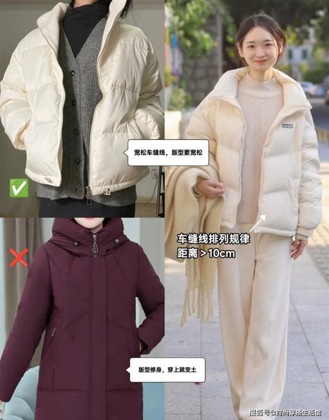 厚实蓬松的羽绒服一定要选宽松的车缝线,平行、斜线或菱形等排列规律的车缝线选择>10cm的距离,这样才不会有显胖显土的顾虑。最后只需再避开过于修身版型,选择宽松廓型款,这样就能轻松拥有一件显瘦又减龄的羽绒服啦!