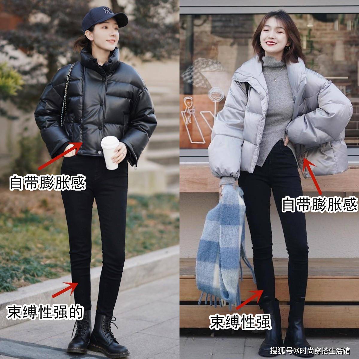 松紧搭配就是将羽绒服和下装的版型在视觉上做出区分,通过版型的碰撞不仅可以营造出绝佳的层次感,而且搭配起来修饰身材的效果也非常好。